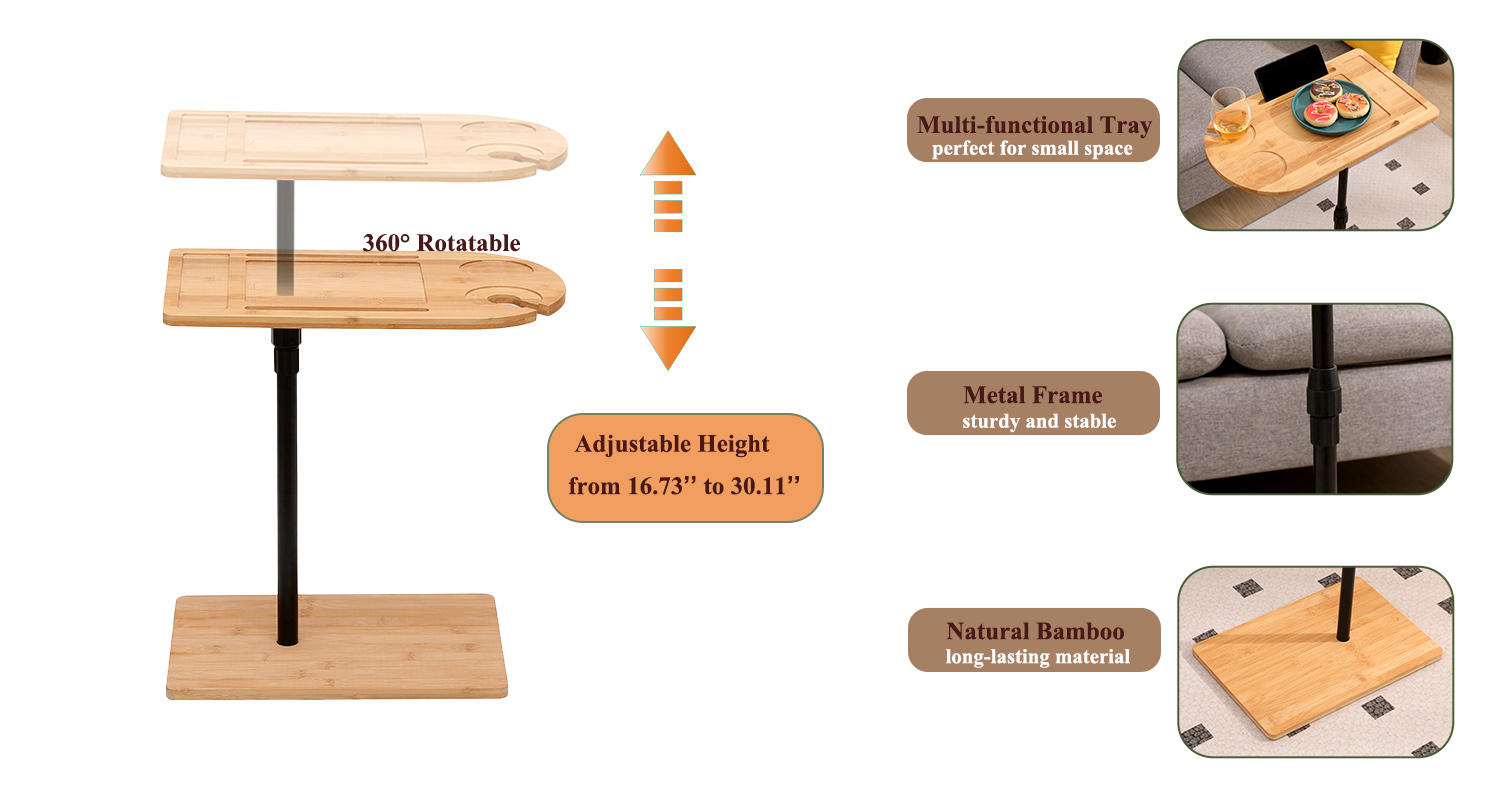 - Multi-Purpose Tray: Enjoy a 360-degree rotatable phone and tablet stand, plus a wine glass holder on a table adjustable from 16.7" to 30.1" high. Use it for TV dinners, movie snacks, or as a couch armrest table. Simplify your life with one versatile piece of furniture.
