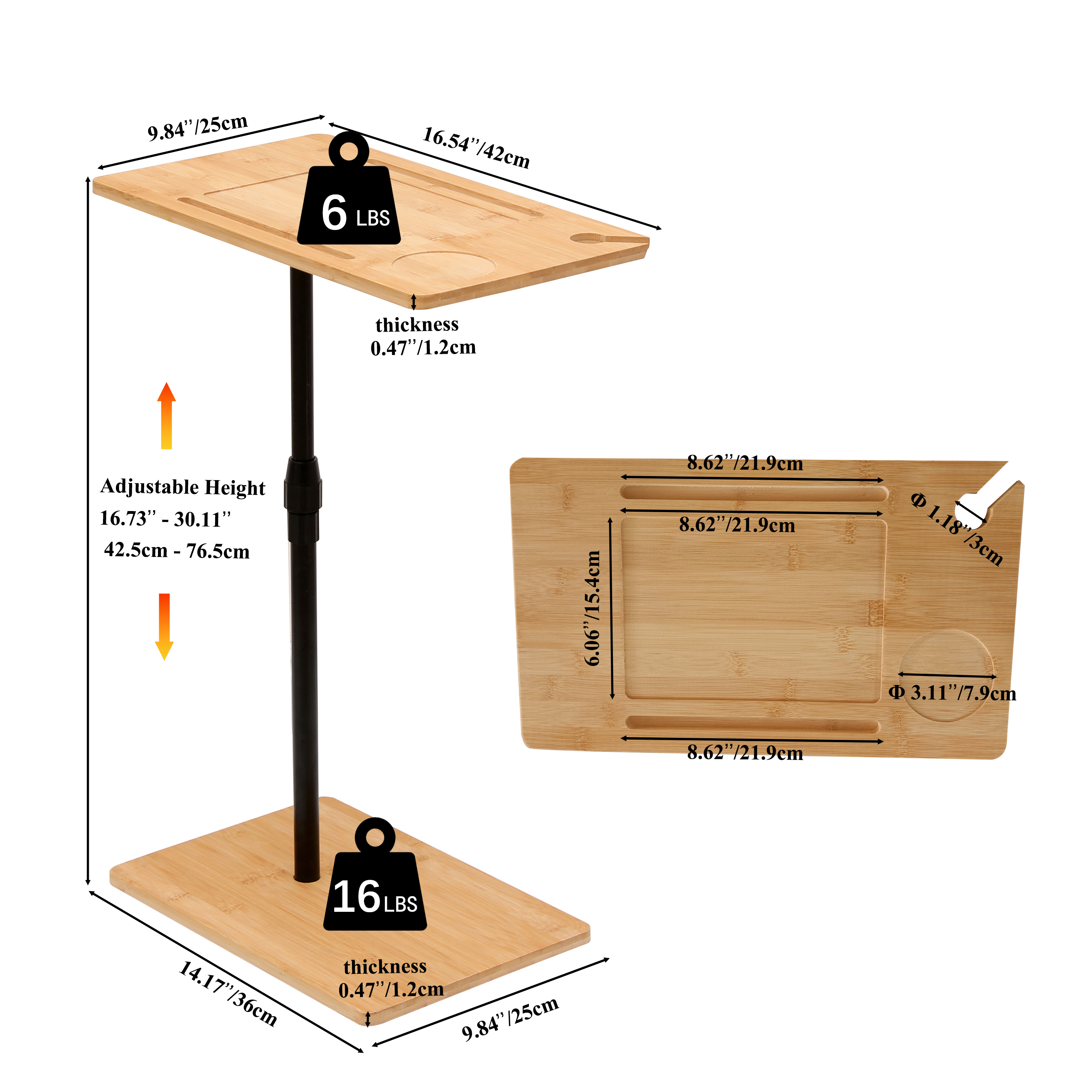 - Height Adjustable & Stable: Our c-shaped table has a customizable height mechanism, making it versatile and convenient for any location in your home. The sturdy bamboo surface and iron weights ensure unmatched stability.