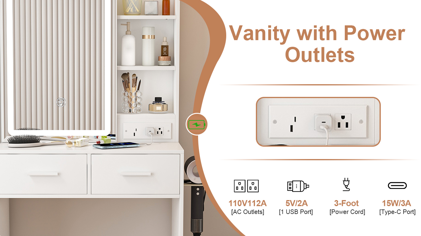 Built - in Power Outlets:This vanity comes with multiple power outlets, including AC outlets, a USB port, and a Type - C port. You can easily charge your phone, tablet, or other beauty devices while doing your makeup.