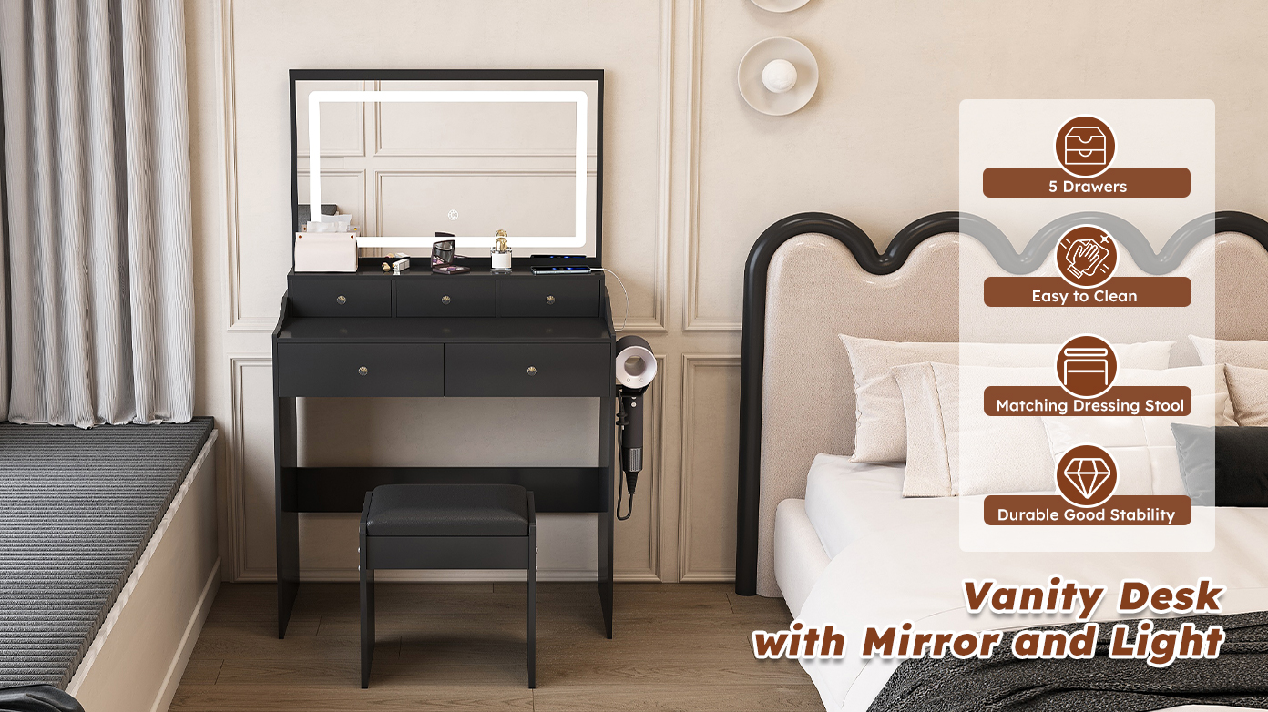 This vanity table with a mirror and lights is really great! It has 5 drawers, which are super convenient for storing small items; the surface is also very easy to clean, just wipe it lightly and it's spotless; the matching stool is very comfortable to sit on; and it's sturdy and stable, lasting for a long time without issues. Placed in the bedroom, it combines style and practicality, making it an excellent little helper for makeup and storage .